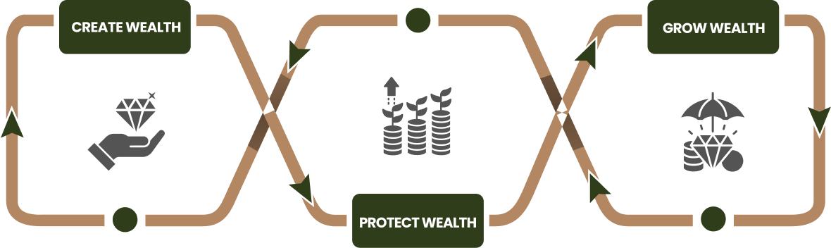 Our philosophy is firmly rooted in creating wealth through concentrated investments, fiercely protecting wealth with diligent risk mitigation strategies, and aggressively growing wealth through strategic diversification, while unwaveringly delivering excellence, integrity, and trust to our clients.